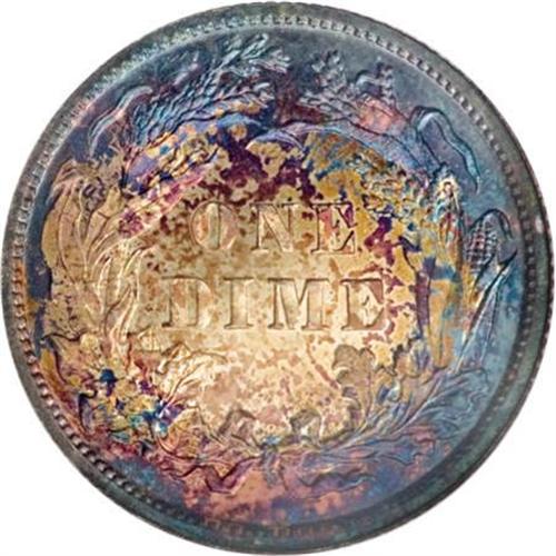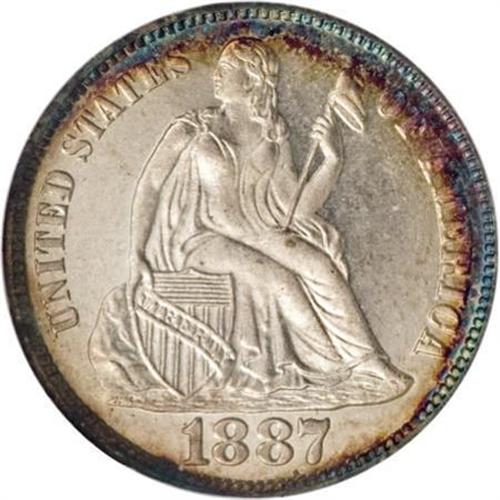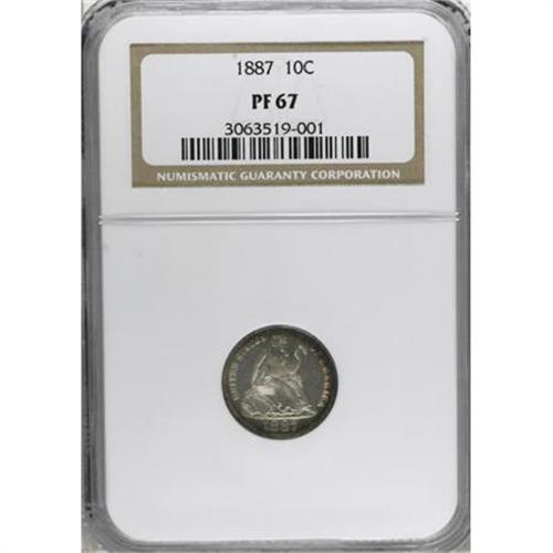 <B>1887 10C PR67 NGC.</B></I> Struck from overpolished dies with incomplete detailing on the drapery near the shield. This is found on a minority of proof 1887 dimes. The surfaces on this piece are deeply reflective in the fields, no doubt from the overzealous repolishing, and there is a slight overlay of mint frost on the devices. The reverse is more toned than the obverse with dusky cinnamon color in the center that deepens to a bright blue at the margin. The obverse is brilliant over most of that side with a couple of thin rings of color present at the periphery. Census: 7 in 67, 0 finer (8/07).<BR><BR><B>Coin Engraver:</B> Christian Gobrecht<BR><BR><b>Shipping:</b> Coins & Currency (<a target="_blank" href="http://www.heritageauctions.com/common/shipping.php">view shipping information</a>)