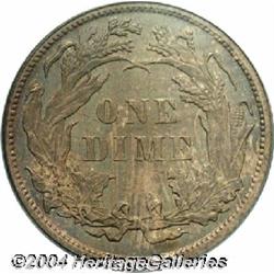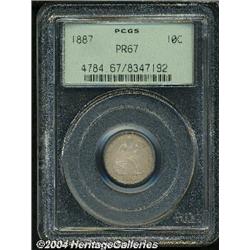 <B>1887<10C> PR67 PCGS.</B></I> Each side has reflective fields with lustrous devices, all subdued by light smoky violet toning. The surfaces are excellent and have only a few tiny blemishes, and these are mostly hidden from view. This is the only PR67 example of this date certified by PCGS; the single finest Proof dime of this date. Contained in an older green-label PCGS holder. <BR><BR><B>Important notice:</B> Heritage usually auctions material at the rate of 200-250 lots per hour. On some occasions eBay Live bid software or the Internet may not be able to keep up with the pace of the auction. We recommend placing a realistic absentee bid now as insurance to avoid disappointment. Occasionally the auctioneer may eliminate or reject an eBay Live bid, and the auctioneer may also reopen a lot after the close of the eBay live bidding (usually because we missed an audience bid), and may reject your bid even if it shows you as the winning bidder. By bidding via eBay Live, you agree that Heritage may award the lot to another bidder at its sole discretion under the circumstances described above or any other reasonable circumstances. Since eBay bids are not shown to us until we open the lot on the floor, we treat those bids just like floor bids. In most cases the floor responds before the eBay bid is presented to us, due to Internet lag time, so for consistency we have made it a policy that floor bids are always considered first over tie eBay live bids. Also please note that all Heritage lots purchased through eBay Live carry a 20% Buyer's Premium. Please make sure you read the Terms and Conditions before you bid.