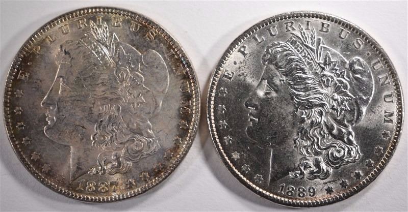 1887 & 1889 MORGAN DOLLARS CH BU, ESTIMATE, $130.00 TO $150.00