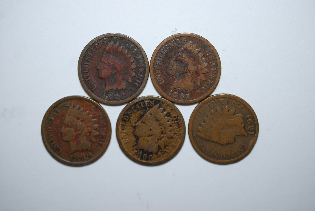1887-1891 Indian Head One Cent; Consecutive Years; Lot of 5; EST. $5-15