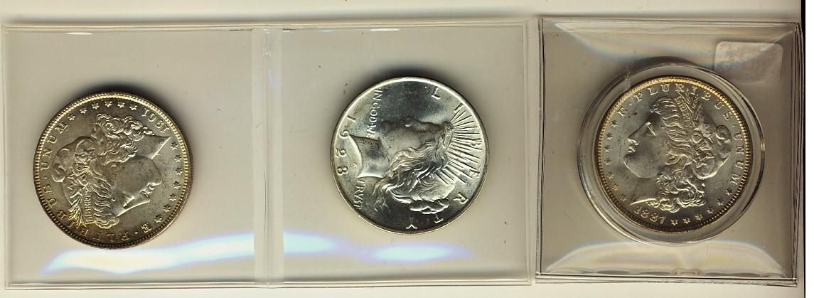 1887, 1901O & 1923 Morgan $1. Lot of 3 ungraded coins. All white and vary in Mintstate condition.