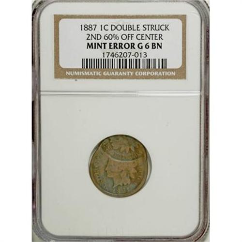 <B>1887 1C Indian Cent--Double Struck, Second Strike 60% Off Center--Good 6 NGC.</B></I> The second strike is widely off center toward 10 o'clock, at 12:30 relative to the first strike. An olive-brown example with few marks and good eye appeal for the certified grade. A date set of double struck Indian cents from 1880 to 1909 is a collectible challenge for the error enthusiast.<BR><BR><B>Coin Engraver:</B> James B. Longacre<BR><BR><b>Shipping:</b> Coins & Currency (<a target="_blank" href="http://www.heritageauctions.com/common/shipping.php">view shipping information</a>)
