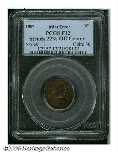 <B>1887<1C> Indian Cent--Struck 22% Off Center--Fine 12 PCGS.</B></I> This glossy Indian Cent is struck prominently off center toward 11:30. Richly toned in golden-brown, mauve, and maroon hues, the wear is a bit uneven since the upper obverse rim is off the flan. The first half of LIBERTY is worn smooth, while the final two letters are bold.<BR><I>From The Larry Rausch Collection of Errors, Part Four.</B></I>