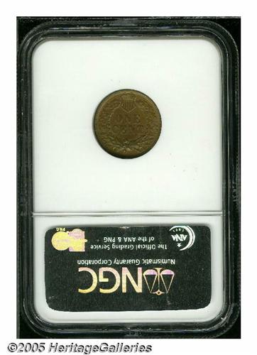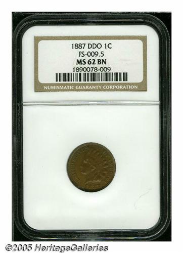 <B>1887<1C> MS62 Brown NGC.</B></I> FS-009.5, Snow-1. OF AMERICA displays broad doubling. Reddish-brown color overlays smooth, nicely preserved surfaces. Softly struck on the Indian's hair and headdress, but boldly detailed on the other design features.