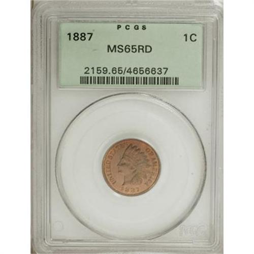 <B>1887 1C MS65 Red PCGS.</B></I> Sharply struck, including complete definition on most of the feather tips and on all four diamonds. Gorgeous orange-gold luster resides on both sides, each of which is devoid of mentionable contacts. We note a couple of small toning spots on the obverse. Housed in a green-label holder. Population: 54 in 65 Red, 15 finer (12/07).<BR><BR><B>Coin Engraver:</B> James B. Longacre<BR><BR><b>Shipping:</b> Coins & Currency (<a target="_blank" href="http://www.heritageauctions.com/common/shipping.php">view shipping information</a>)