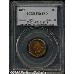 <B>1887<1C> PR64 Red PCGS.</B></I> This well struck orange-red near-Gem has faint vertical wisps of apricot color on the central reverse and a blush of dusky hues east of the date. Essentially free from contact, and undeniably scarce with full Red color. Population: 9 in 64, 10 finer (3/04). <BR><BR><B>Important notice:</B> Heritage usually auctions material at the rate of 200-250 lots per hour. On some occasions eBay Live bid software or the Internet may not be able to keep up with the pace of the auction. We recommend placing a realistic absentee bid now as insurance to avoid disappointment. Occasionally the auctioneer may eliminate or reject an eBay Live bid, and the auctioneer may also reopen a lot after the close of the eBay live bidding (usually because we missed an audience bid), and may reject your bid even if it shows you as the winning bidder. By bidding via eBay Live, you agree that Heritage may award the lot to another bidder at its sole discretion under the circumstances described above or any other reasonable circumstances. Since eBay bids are not shown to us until we open the lot on the floor, we treat those bids just like floor bids. In most cases the floor responds before the eBay bid is presented to us, due to Internet lag time, so for consistency we have made it a policy that floor bids are always considered first over tie eBay live bids. Also please note that all Heritage lots purchased through eBay Live carry a 20% Buyer's Premium. Please make sure you read the Terms and Conditions before you bid.
