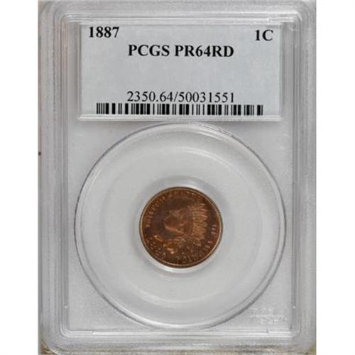 <B>1887 1C PR64 Red PCGS.</B></I> This boldly struck specimen is mostly yellow-gold in color, with dashes of rose hue on the cheek and LIBERTY. Two small navy-blue toning flecks are noted on the O and E in ONE. The four diamonds are fully defined.<BR><BR><B>Coin Engraver:</B> James B. Longacre<BR><BR><b>Shipping:</b> Coins & Currency (<a target="_blank" href="http://www.heritageauctions.com/common/shipping.php">view shipping information</a>)