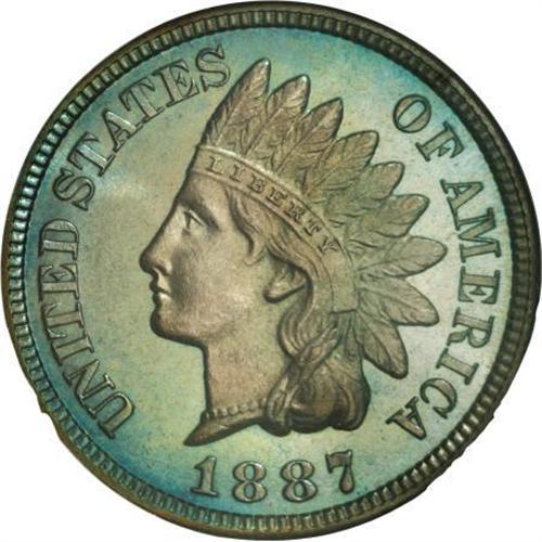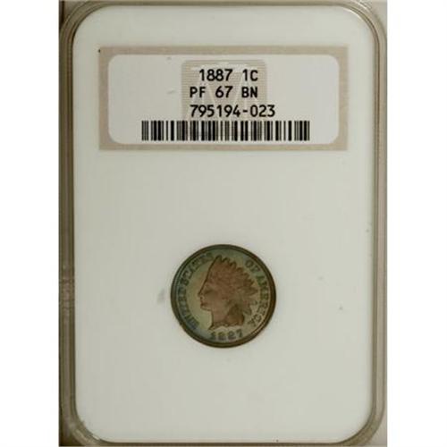 <B>1887 1C PR67 Brown NGC.</B></I> The light rose-tan Indian portrait stands out beautifully against the bluish-gold fields, while the reverse displays a swath of bright reddish-gold at the right border that yields to a narrow strip of magenta and then to intense electric-blue coloration to the left. Sharply struck, with no mentionable marks. In <I>A Guide Book of Flying Eagle and Indian Cents</B></I>, Rick Snow notes that "The mintage dipped slightly this year, but this does little to change the rarity rating compared to other dates in the 1880s. Many 1887 cents are found with pale tan-golden planchets. Many others have toned to brown, sometimes with vivid iridescent blue toning, which is worth a significant premium." Census: 4 in 67 Brown, 0 finer (11/07).<BR><I>From The New York Eye Appeal Collection, Part Three.</B></I><BR><BR><B>Coin Engraver:</B> James B. Longacre<BR><BR><b>Shipping:</b> Coins & Currency (<a target="_blank" href="http://www.heritageauctions.com/common/shipping.php">view shipping information</a>)