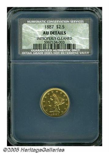 <B>1887<$2 1/2> AU Details, Improperly Cleaned, NCS.</B></I> Brassy-gold surfaces are very bright and display fine hairlines. Generally well defined, though most of the star centers are weak. Light contact marks are scattered about, being most noticeable on Liberty's cheek and neck. A relatively scarce, low mintage issue with only 6,160 business strikes produced.