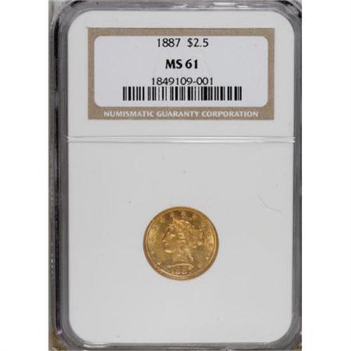 <B>1887 $2 1/2 MS61 NGC.</B></I> This attentively struck and unblemished better date quarter eagle has good luster and excellent eye appeal. Only 6,160 business strikes were produced.<BR><BR><b>Shipping:</b> Coins & Currency (<a target="_blank" href="http://www.heritageauctions.com/common/shipping.php">view shipping information</a>)
