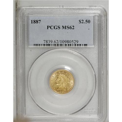 <B>1887 $2 1/2 MS62 PCGS.</B></I> Crisply struck with a handful of light abrasions in the amber-gold fields, which have hints of green and orange. The surfaces show a trace of reflectivity, unsurprising given the mintage of 6,160 pieces. Population: 27 in 62, 32 finer (11/06).<BR><BR><b>Shipping:</b> Coin/Currency (<a target="_blank" href="http://www.heritageauctions.com/common/shipping.php">view shipping information</a>)