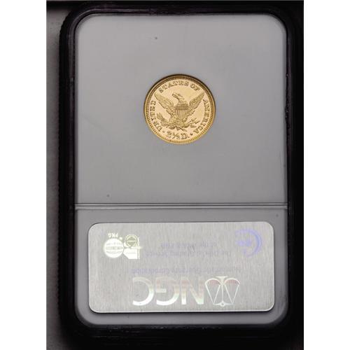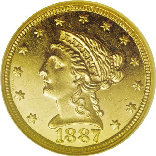 <B>1887<$2 1/2> MS62 Prooflike NGC.</B></I> The Philadelphia Mint produced relatively minuscule numbers of quarters, half dollars, and quarter eagles during the period from 1879 through 1890, when the emphasis was on coining enormous quantities of Morgan dollars to satisfy the requirements of the Bland-Allison Act of 1878. The 1887 quarter eagle was produced only to the extent of about 6,160 pieces. The brilliant straw-gold surfaces are fully prooflike and aesthetically appealing on both sides. Under a loupe, many fine hairlines and tiny abrasions can be seen, along with a couple of small pinscratches near star 5. Census: 3 in 62 Prooflike, 3 finer (4/06).