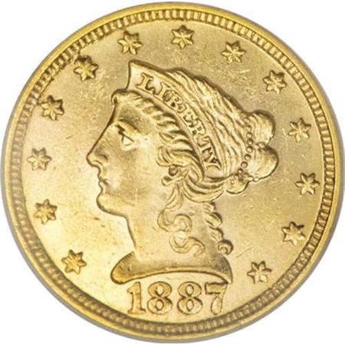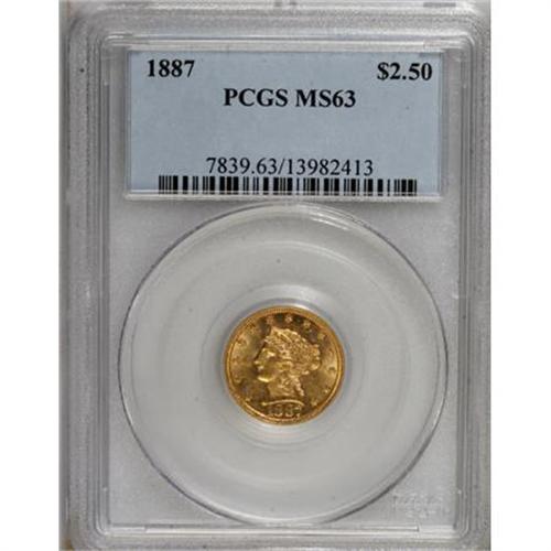 <B>1887 $2 1/2 MS63 PCGS.</B></I> This glittering example displays prooflike fields and attractive coloration. Some of the obverse stars are softly struck, but the other design elements are crisply defined. A few trivial marks prevent a higher grade designation. According to Garrett and Guth: "The 1887 Liberty Head quarter eagle is a scarce coin in all grades." Population: 16 in 63, 12 finer (8/07). <BR><BR><B>Coin Engraver:</B> Christian Gobrecht<BR><BR><b>Shipping:</b> Coins & Currency (<a target="_blank" href="http://www.heritageauctions.com/common/shipping.php">view shipping information</a>)