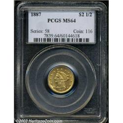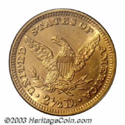 <table><tr><td><TABLE cellSpacing=0 cellPadding=0 width="100%" bgColor=#000000 border=0><TBODY> <TR><TD width="100%"><TABLE cellSpacing=1 cellPadding=3 width="100%" border=0><TBODY><TR><TD width="100%" bgColor=#79735c><FONT face=arial color=#ffffff size=3><B>Description</B> </FONT></TD></TR><TR><TD width="100%" bgColor=#ffffff><FONT face=arial size=2><B>1887 $2 1/2 MS64 PCGS.</B></I> An overlooked date in the quarter eagle series with only 6,160 business strikes produced. This piece is fully struck, as always, with just the faintest glimmer of reflectivity in the fields. Rich reddish-orange color is seen over each side of this lovely, high grade example. Population: 10 in 64, 0 finer (8/03). </FONT></TD></TR></TBODY></TABLE></TD></TR></TBODY></TABLE><BR><A name=PricesRealized></A><TABLE cellSpacing=0 cellPadding=0 width="100%" bgColor=#000000 border=0><TBODY><TR><TD width="100%"><TABLE cellSpacing=1 cellPadding=3 width="100%" border=0><TBODY><TR><TD width="100%" bgColor=#79735c><A name=PR><FONT face=arial color=#ffffff size=3><B>Previous Prices from Heritage Auctions</B> </FONT></A></TD></TR><TR><TD bgColor=#f6f6ed><TABLE cellSpacing=0 cellPadding=0 width="100%" border=1><TBODY><TR><TD align=middle width="33%"><B>Date</B></TD><TD align=middle width="33%"><B>Service</B></TD><TD align=middle width="33%"><B>Price</B></TD></TR><TR bgColor=whitesmoke><TD width="33%"><B>11/23/2002</B></TD><TD width="33%">PCGS</TD><TD width="33%">$4,485.00</TD></TR><TR bgColor=whitesmoke><TD width="33%"><B>02/01/1997</B></TD><TD width="33%">PCGS</TD><TD width="33%">$3,960.00</TD></TR><TR bgColor=whitesmoke><TD width="33%"><B>09/01/1996</B></TD><TD width="33%">PCGS</TD><TD width="33%">$4,620.00</TD></TR></TBODY></TABLE></TD></TR><TR><TD bgColor=#ffffff><FONT face=arial size=1 ?>PLEASE NOTE: All prices realized reflect the final hammer price PLUS the buyer's premium in auctions that charge a buyer's premium. Each item has a notation at the top of the listing indicating whether that lot included a buyer's premium. Example: A item that sells with a final hammer price of $100 and a 20% buyer's premium will display with a price realized of $120. All information listed is intended to be as accurate as possible, but errors are possible. Please use this guide carefully and inform us of any inaccuracies. </FONT></TD></TR></TBODY></TABLE></TD></TR></TBODY></TABLE><BR><TABLE cellSpacing=0 cellPadding=0 width="100%" bgColor=#000000 border=0><TBODY><TR><TD width="100%"><TABLE cellSpacing=1 cellPadding=3 width="100%" border=0><TBODY><TR><TD width="100%" bgColor=#79735c colSpan=6><FONT face=arial color=#ffffff size=3><B>Price Guide*</B> </FONT></TD></TR><TR bgColor=#f6f6ed><TD align=middle><B>Grade</B> </TD><TD align=middle><B>Coin World<BR>(Trends)</B> </TD><TD align=middle><B>Numismedia<BR>Retail</B> </TD><TD align=middle><B>Numismedia<BR>Wholesale</B> </TD><TD align=middle><B>Coin<BR>Universe</B> </TD><TD align=middle><B>Heritage<BR>Value Index</B> </TD></TR><TR bgColor=#ffffff><TD align=middle>63</TD><TD align=right>$2,850.00</TD><TD align=right>---</TD><TD align=right>$2,175.00</TD><TD align=right>$3,250.00</TD><TD align=right>$2,033.13</TD></TR><TR style="FONT-WEIGHT: bold" bgColor=#cccfdd><TD align=middle>64</TD><TD align=right>$5,750.00</TD><TD align=right>---</TD><TD align=right>---</TD><TD align=right>$6,250.00</TD><TD align=right>$4,150.00</TD></TR><TR bgColor=#ffffff><TD align=middle>65</TD><TD align=right>---</TD><TD align=right>---</TD><TD align=right>---</TD><TD align=right>---</TD><TD align=right>---</TD></TR><TR bgColor=#ffffff><TD colSpan=6><FONT size=1>*All information listed is intended to be as accurate as possible, but errors are possible. No item may be returned or refused based on this information which is provided as a service to our customers. You should contact each pricing source directly to determine the accuracy of this information. </FONT></TD></TR></TBODY></TABLE></TD></TR></TBODY></TABLE><BR><TABLE cellSpacing=0 cellPadding=0 width="100%" bgColor=#000000 border=0><TBODY><TR><TD width="100%"><TABLE cellSpacing=1 cellPadding=3 width="100%" border=0><TBODY><TR><TD width="100%" bgColor=#79735c><FONT face=arial color=#ffffff size=3><B>Population Guide</B> </FONT></TD></TR><TR bgColor=#ffffff><TD align=middle><!-- Begin Output of Population Grid--><TABLE cellSpacing=0 cellPadding=0 width="100%" border=0><TBODY><TR><TD vAlign=center><TABLE cellSpacing=0 width="100%" border=1 cellsadding="3"><TBODY><TR><TD vAlign=center><TABLE cellSpacing=0 cellPadding=3 width="100%" border=1><TBODY><TR><TD vAlign=center align=middle bgColor=#f0f1e8 colSpan=2 <CENTER><FONT face=Arial size=2><B>PCGS Pop </B></FONT><CENTER></CENTER></TD><TD vAlign=center align=middle bgColor=#f0f1e8 colSpan=2><CENTER><FONT face=Arial size=2><B>NGC Pop</B></CENTER></FONT></TD></TR><TR><TD vAlign=center><FONT face=Arial size=2>(64)</FONT> </TD><TD vAlign=center align=right><FONT face=Arial size=2>13</FONT> </TD><TD vAlign=center><FONT face=Arial size=2>(64)</FONT> </TD><TD vAlign=center align=right><FONT face=Arial size=2>15</FONT> </TD></TR><TR><TD vAlign=center><FONT face=Arial size=2>(>64)</FONT> </TD><TD vAlign=center align=right><FONT face=Arial size=2>0</FONT> </TD><TD vAlign=center><FONT face=Arial size=2>(>64)</FONT> </TD><TD vAlign=center align=right><FONT face=Arial size=2>1</FONT> </TD></TR></TBODY></TABLE></TD></TR></TBODY></TABLE></TD></TR></TBODY></TABLE><!-- End Output of Population Grid--></TD></TR></TBODY></TABLE></TD></TR></TBODY></TABLE><BR><TABLE cellSpacing=0 cellPadding=0 width="100%" bgColor=#000000 border=0><TBODY><TR> Important notice: Heritage usually auctions material at the rate of 200-250 lots per hour. On some occasions eBay Live bid software or the Internet may not be able to keep up with the pace of the auction. We recommend placing a realistic absentee bid now as insurance to avoid disappointment. Occasionally the auctioneer may eliminate or reject an eBay Live bid, and the auctioneer may also reopen a lot 