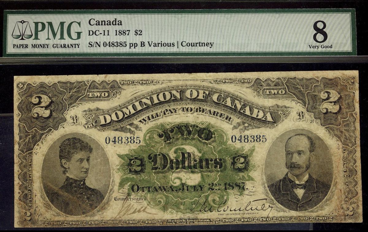 1887 $2 DC-11 #048385 PMG VG8. A solid example for grade. Colurs are strong.