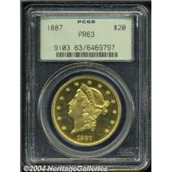 <table><tbody><tr><td><table> <TR><TD width="100%"><TABLE cellSpacing=1 cellPadding=3 width="100%" border=0><TBODY><TR><TD width="100%" bgColor=#79735c><FONT face=arial color=#ffffff size=3><B>Description</B> </FONT></TD></TR><TR><TD width="100%" bgColor=#ffffff><FONT face=arial size=2><B>1887 $20 PR63 PCGS.</B></I> The proof-only 1887 is another great rarity in the series of Liberty Double Eagles, with precious few extant pieces from an already tiny original production of 121 proofs. However, its low survival ratio suggests that some of these were never released and were later melted. Given the fact that there are around 25-30 survivors, it would seem logical that 50 or so pieces were lost to collectors in this manner.<BR>The bright, watery mirrors of this Select specimen have the desirable "orange-peel" effect of proof gold coinage from this era and display a modest degree of contrast with the central devices. Wispy blemishes on the obverse are well scattered and not immediately obvious to the unaided eye. For those attempting to assemble a date set of Twenties or the ultra challenging complete set, the 1887 is certainly one of the most challenging issues in the series. Population: 3 in 63, 10 finer (10/03).<BR><I>From a Magnificent Collection of Double Eagles.</B></I> </FONT></TD></TR></TBODY></TABLE></TD></TR></TBODY></TABLE><BR><A name=PricesRealized></A><TABLE cellSpacing=0 cellPadding=0 width="100%" bgColor=#000000 border=0><TBODY><TR><TD width="100%"><TABLE cellSpacing=1 cellPadding=3 width="100%" border=0><TBODY><TR><TD width="100%" bgColor=#79735c><A name=PR><FONT face=arial color=#ffffff size=3><B>Previous Prices from Heritage Auctions</B> </FONT></A></TD></TR><TR><TD bgColor=#f6f6ed><TABLE cellSpacing=0 cellPadding=0 width="100%" border=1><TBODY><TR><TD align=middle width="33%"><B>Date</B></TD><TD align=middle width="33%"><B>Service</B></TD><TD align=middle width="33%"><B>Price</B></TD></TR><TR bgColor=whitesmoke><TD width="33%"><B>02/01/1991</B></TD><TD width="33%">PCGS</TD><TD width="33%">$37,400.00</TD></TR><TR bgColor=whitesmoke><TD width="33%"><B>01/01/1993</B></TD><TD width="33%">NGC</TD><TD width="33%">$26,400.00</TD></TR></TBODY></TABLE></TD></TR><TR><TD bgColor=#ffffff><FONT face=arial size=1 ?>PLEASE NOTE: All prices realized reflect the final hammer price PLUS the buyer's premium in auctions that charge a buyer's premium. Each item has a notation at the top of the listing indicating whether that lot included a buyer's premium. Example: A item that sells with a final hammer price of $100 and a 20% buyer's premium will display with a price realized of $120. All information listed is intended to be as accurate as possible, but errors are possible. Please use this guide carefully and inform us of any inaccuracies. </FONT></TD></TR></TBODY></TABLE></TD></TR></TBODY></TABLE><BR><TABLE cellSpacing=0 cellPadding=0 width="100%" bgColor=#000000 border=0><TBODY><TR><TD width="100%"><TABLE cellSpacing=1 cellPadding=3 width="100%" border=0><TBODY><TR><TD width="100%" bgColor=#79735c colSpan=6><FONT face=arial color=#ffffff size=3><B>Price Guide*</B> </FONT></TD></TR><TR bgColor=#f6f6ed><TD align=middle><B>Grade</B> </TD><TD align=middle><B>Coin World<BR>(Trends)</B> </TD><TD align=middle><B>Numismedia<BR>Retail</B> </TD><TD align=middle><B>Numismedia<BR>Wholesale</B> </TD><TD align=middle><B>Coin<BR>Universe</B> </TD><TD align=middle><B>Heritage<BR>Value Index</B> </TD></TR><TR bgColor=#ffffff><TD align=middle>62</TD><TD align=right>---</TD><TD align=right>---</TD><TD align=right>---</TD><TD align=right>$31,500.00</TD><TD align=right>$22,650.00</TD></TR><TR style="FONT-WEIGHT: bold" bgColor=#cccfdd><TD align=middle>63</TD><TD align=right>---</TD><TD align=right>---</TD><TD align=right>$37,500.00</TD><TD align=right>$39,500.00</TD><TD align=right>$26,200.00</TD></TR><TR bgColor=#ffffff><TD align=middle>64</TD><TD align=right>---</TD><TD align=right>---</TD><TD align=right>$41,400.00</TD><TD align=right>$56,500.00</TD><TD align=right>$39,350.00</TD></TR><TR bgColor=#ffffff><TD colSpan=6><FONT size=1>*All information listed is intended to be as accurate as possible, but errors are possible. No item may be returned or refused based on this information which is provided as a service to our customers. You should contact each pricing source directly to determine the accuracy of this information. </FONT></TD></TR></TBODY></TABLE></TD></TR></TBODY></TABLE><BR><TABLE cellSpacing=0 cellPadding=0 width="100%" bgColor=#000000 border=0><TBODY><TR><TD width="100%"><TABLE cellSpacing=1 cellPadding=3 width="100%" border=0><TBODY><TR><TD width="100%" bgColor=#79735c><FONT face=arial color=#ffffff size=3><B>Population Guide</B> </FONT></TD></TR><TR bgColor=#ffffff><TD align=middle><!-- Begin Output of Population Grid--><TABLE cellSpacing=0 cellPadding=0 width="100%" border=0><TBODY><TR><TD vAlign=center><TABLE cellSpacing=0 width="100%" border=1 cellsadding="3"><TBODY><TR><TD vAlign=center><TABLE cellSpacing=0 cellPadding=3 width="100%" border=1><TBODY><TR><TD vAlign=center align=middle bgColor=#f0f1e8 colSpan=2 <CENTER><FONT face=Arial size=2><B>PCGS Pop </B></FONT><CENTER></CENTER></TD><TD vAlign=center align=middle bgColor=#f0f1e8 colSpan=2><CENTER><FONT face=Arial size=2><B>NGC Pop</B></CENTER></FONT></TD></TR><TR><TD vAlign=center><FONT face=Arial size=2>(63)</FONT> </TD><TD vAlign=center align=right><FONT face=Arial size=2>3</FONT> </TD><TD vAlign=center><FONT face=Arial size=2>(63)</FONT> </TD><TD vAlign=center align=right><FONT face=Arial size=2>0</FONT> </TD></TR><TR><TD vAlign=center><FONT face=Arial size=2>(>63)</FONT> </TD><TD vAlign=center align=right><FONT face=Arial size=2>10</FONT> </TD><TD vAlign=center><FONT face=Arial size=2>(>63)</FONT> </TD><TD vAlign=center align=right><FONT face=Arial size=2>1</FONT> </TD></TR></TBODY></TABLE></TD></TR></TBODY></TABLE></TD></TR></TBODY></TABLE><!-- End Output of Population Grid--></TD></TR></TBODY></TABLE></TD></TR></TBODY></TABLE><BR><TABL
