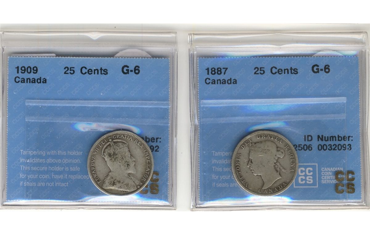 1887 25¢ & 1909 CCCS G6. Lot of 2 coins.