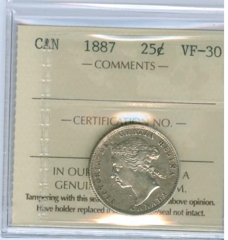 1887 25¢ ICCS VF30. Key issue with nice strike.