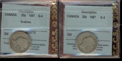 1887 25¢, Lot of two coins both CCCS graded G4, one piece has a scratch.