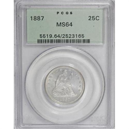 <B>1887 25C MS64 PCGS.</B></I> Both sides of this enticing quarter offer powerful, almost flashy luster. The boldly impressed eagle sports delightful frost as well. Pleasingly preserved and delightful. Population: 23 in 64, 40 finer (11/07).<BR><BR><B>Coin Engraver:</B> Christian Gobrecht<BR><BR><b>Shipping:</b> Coins & Currency (<a target="_blank" href="http://www.heritageauctions.com/common/shipping.php">view shipping information</a>)