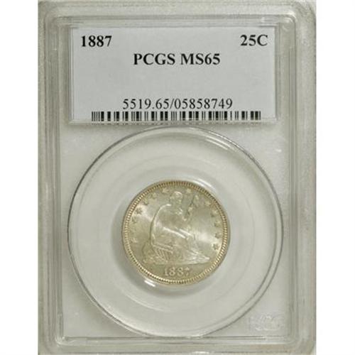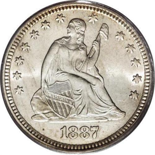 <B>1887 25C MS65 PCGS.</B></I> The paltry business strike emission was 10,000 coins, plus 710 proofs. This piece displays brilliant silver surfaces lightly tinged with gold, and booming luster radiates from both sides. The right-side stars are weakly struck, and a light scrape is noted in the upper left obverse field. Population: 18 in 65, 23 finer (3/08).<BR><BR><B>Coin Engraver:</B> Christian Gobrecht<BR><BR><b>Shipping:</b> Coins & Currency (<a target="_blank" href="http://www.heritageauctions.com/common/shipping.php">view shipping information</a>)