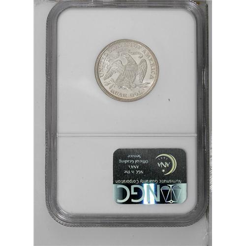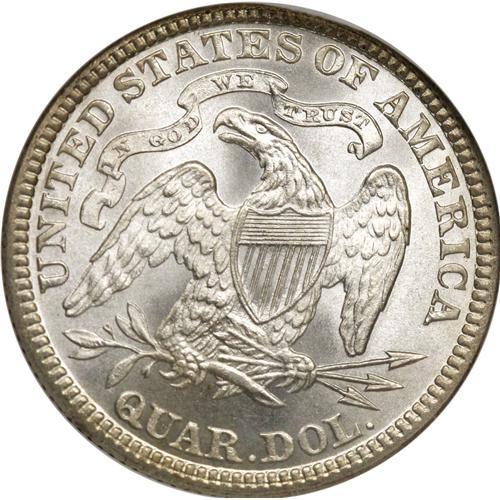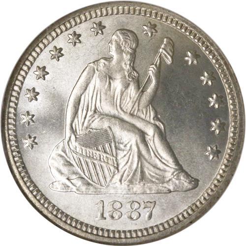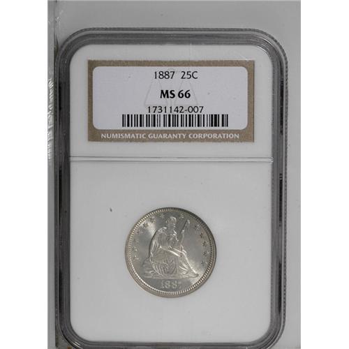 <B>1887<25C> MS66 NGC.</B></I> Although mintages of dimes reached a then-record level of more than 11 million pieces, the production of quarters was limited to 10,000 business strikes and 710 proofs. Quarters and halves had small mintages because of the Bland-Allison act, which compelled the Philadelphia Mint to produce more than 20 million silver dollars in 1887. Shrewd numismatists of the era set aside quantities of quarters and halves, but these are nonetheless elusive today in all grades. This lustrous Premium Gem has light tan toning and remarkably unabraded fields and devices. The strike is pleasing on the major devices, and somewhat soft only on the right side stars. Census: 16 in 66, 13 finer (7/06).