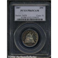 <B>1887<25C> PR65 Cameo PCGS.</B></I> Lovely apricot toning graces the peripheral areas, along with an occasional flash of bluish-green color. Population: 1 in 65 Cameo, 2 finer (3/04).<BR><I>Ex: Kreisberg, Schulman Sale (5/66), lot 2034, where it brought $74.</B></I> <BR><BR><B>Important notice:</B> Heritage usually auctions material at the rate of 200-250 lots per hour. On some occasions eBay Live bid software or the Internet may not be able to keep up with the pace of the auction. We recommend placing a realistic absentee bid now as insurance to avoid disappointment. Occasionally the auctioneer may eliminate or reject an eBay Live bid, and the auctioneer may also reopen a lot after the close of the eBay live bidding (usually because we missed an audience bid), and may reject your bid even if it shows you as the winning bidder. By bidding via eBay Live, you agree that Heritage may award the lot to another bidder at its sole discretion under the circumstances described above or any other reasonable circumstances. Since eBay bids are not shown to us until we open the lot on the floor, we treat those bids just like floor bids. In most cases the floor responds before the eBay bid is presented to us, due to Internet lag time, so for consistency we have made it a policy that floor bids are always considered first over tie eBay live bids. Also please note that all Heritage lots purchased through eBay Live carry a 20% Buyer's Premium. Please make sure you read the Terms and Conditions before you bid.
