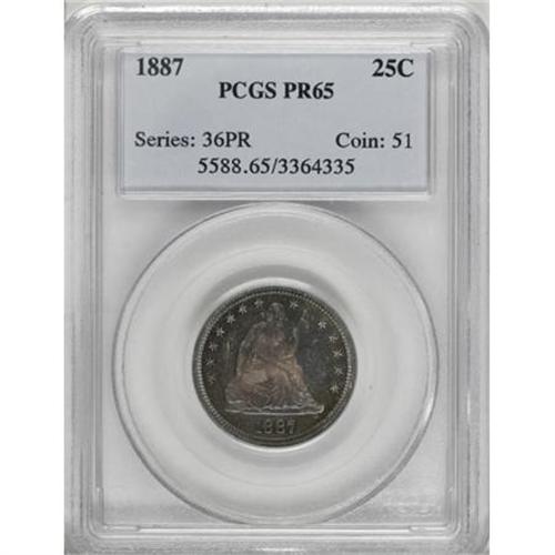 <B>1887 25C PR65 PCGS.</B></I> Electric-blue and deep purple toning runs over both faces of this attractive Gem proof quarter, neither of which reveals mentionable blemishes. The motifs are in receipt of a well directed strike. Population: 37 in 65, 22 finer (1/08).<BR><BR><B>Coin Engraver:</B> Christian Gobrecht<BR><BR><b>Shipping:</b> Coins & Currency (<a target="_blank" href="http://www.heritageauctions.com/common/shipping.php">view shipping information</a>)