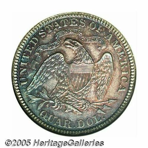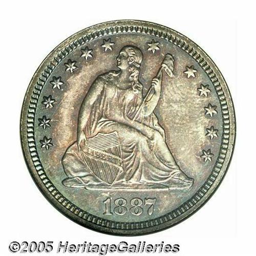 <B>1887<25C> PR66 NGC.</B></I> The 1887 is one of the popular issues struck between 1879 and 1890. Only 710 proofs and 10,000 business strikes were produced and high grade survivors are always in demand by collectors. This is a nicely reflective example that has deeply toned, crimson-rose centers that are surrounded by electric-blue around the peripheries on both sides. An exceptionally attractive Gem proof 1887 Quarter. Population: 31 in 66, 11 finer (5/05).