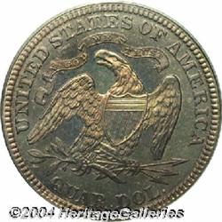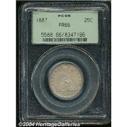 <B>1887<25C> PR66 PCGS.</B></I> PCGS has handed this grade to several examples of this issue, but only three finer coins have ever been certified. This is a sharply struck Premium Gem Proof with pale heather toning on the obverse, much deeper on the reverse. The fields are rather deeply mirrored, although the obverse toning tends to diminish the depth of field. The reverse toning, however, actually seems to enhance the deep mirrors. A wonderful option for the date or type specialist. Population: 20 in 66, 3 finer (9/04). <BR><BR><B>Important notice:</B> Heritage usually auctions material at the rate of 200-250 lots per hour. On some occasions eBay Live bid software or the Internet may not be able to keep up with the pace of the auction. We recommend placing a realistic absentee bid now as insurance to avoid disappointment. Occasionally the auctioneer may eliminate or reject an eBay Live bid, and the auctioneer may also reopen a lot after the close of the eBay live bidding (usually because we missed an audience bid), and may reject your bid even if it shows you as the winning bidder. By bidding via eBay Live, you agree that Heritage may award the lot to another bidder at its sole discretion under the circumstances described above or any other reasonable circumstances. Since eBay bids are not shown to us until we open the lot on the floor, we treat those bids just like floor bids. In most cases the floor responds before the eBay bid is presented to us, due to Internet lag time, so for consistency we have made it a policy that floor bids are always considered first over tie eBay live bids. Also please note that all Heritage lots purchased through eBay Live carry a 20% Buyer's Premium. Please make sure you read the Terms and Conditions before you bid.