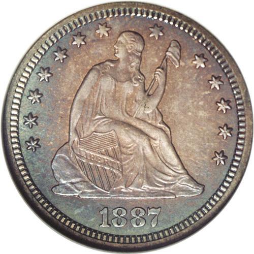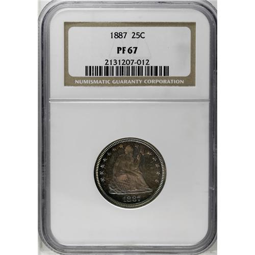 1887 25C PR67 NGC. Rich golden-brown, sea-green, and o