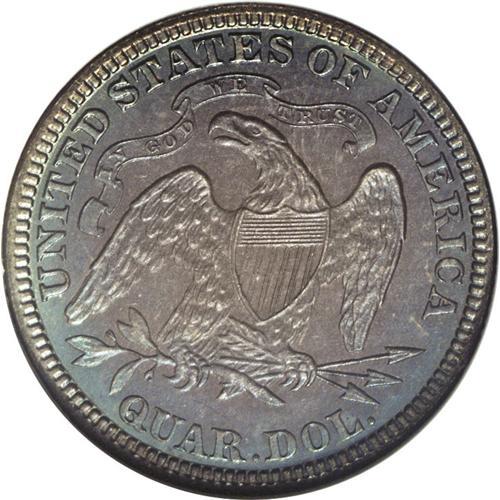 <B>1887<25C> PR67 NGC.</B></I> Rich golden-brown, sea-green, and ocean-blue toning illuminates the obverse. The reverse displays deep plum and cobalt-blue patina. Well struck save for the uppermost stars. Due to continued massive silver dollar production, mintages of quarters lagged. Just 10,000 business strikes and 710 proofs were issued. Census: 11 in 67, 1 finer (6/06).<BR><I>From The Mulholland Collection.</B></I>