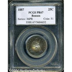 <B>1887<25C> PR67 PCGS.</B></I> Ex: Benson Collection. The obverse is deeply toned in murky shades of dark-violet and cobalt-blue, with gold, gray-green, and lavender patina on the reverse. The fields display watery, deep reflectivity, and the surfaces overall seem impeccably preserved and mark-free. This date was restricted to only 710 proofs and 10,000 business strikes, making it relatively scarce in all grades, and rare as a Superb Gem. Population: 3 in 67, 0 finer (3/04).<BR><I>Ex: Benson Collection, Part II (Ira & Larry Goldberg, 2/02), lot 753, which realized $6037.50.</B></I><BR><I>From the JFS Collection.</B></I> <BR><BR><B>Important notice:</B> Heritage usually auctions material at the rate of 200-250 lots per hour. On some occasions eBay Live bid software or the Internet may not be able to keep up with the pace of the auction. We recommend placing a realistic absentee bid now as insurance to avoid disappointment. Occasionally the auctioneer may eliminate or reject an eBay Live bid, and the auctioneer may also reopen a lot after the close of the eBay live bidding (usually because we missed an audience bid), and may reject your bid even if it shows you as the winning bidder. By bidding via eBay Live, you agree that Heritage may award the lot to another bidder at its sole discretion under the circumstances described above or any other reasonable circumstances. Since eBay bids are not shown to us until we open the lot on the floor, we treat those bids just like floor bids. In most cases the floor responds before the eBay bid is presented to us, due to Internet lag time, so for consistency we have made it a policy that floor bids are always considered first over tie eBay live bids. Also please note that all Heritage lots purchased through eBay Live carry a 20% Buyer's Premium. Please make sure you read the Terms and Conditions before you bid. </span></font></tr></table></td></tr></table>