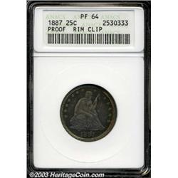<TABLE cellSpacing=0 cellPadding=0 width="100%" bgColor=#000000 border=0><TBODY><TR><TD width="100%"><TABLE cellSpacing=1 cellPadding=3 width="100%" border=0><TBODY><TR><TD width="100%" bgColor=#79735c><FONT face=arial color=#ffffff size=3><B>Description</B> </FONT></TD></TR><TR><TD width="100%" bgColor=#ffffff><FONT face=arial size=2><B>1887 25C Quarter--Rim Clip--PR64 ANACS.</B></I> Aqua-marine and honey-gold colors enliven this lovely near-Gem. The rim at 1 o'clock on the obverse and opposite at 5 o'clock on the reverse is softly defined, as made due to a small clip. An unusual error on a 19th Century proof coin. Only 710 proofs were issued, along with a scant 10,000 business strikes. </FONT></TD></TR></TBODY></TABLE></TD></TR></TBODY></TABLE><BR><A name=PricesRealized></A><TABLE cellSpacing=0 cellPadding=0 width="100%" bgColor=#000000 border=0><TBODY><TR><TD width="100%"><TABLE cellSpacing=1 cellPadding=3 width="100%" border=0><TBODY><TR><TD width="100%" bgColor=#79735c><A name=PR><FONT face=arial color=#ffffff size=3><B>Previous Prices from Heritage Auctions</B> </FONT></A></TD></TR><TR><TD bgColor=#f6f6ed><TABLE cellSpacing=0 cellPadding=0 width="100%" border=1><TBODY><TR><TD align=middle width="33%"><B>Date</B></TD><TD align=middle width="33%"><B>Service</B></TD><TD align=middle width="33%"><B>Price</B></TD></TR><TR bgColor=whitesmoke><TD width="33%"><B>02/12/2000</B></TD><TD width="33%">PCGS</TD><TD width="33%">$690.00</TD></TR><TR bgColor=whitesmoke><TD width="33%"><B>11/15/2001</B></TD><TD width="33%">NGC</TD><TD width="33%">$672.75</TD></TR></TBODY></TABLE></TD></TR><TR><TD bgColor=#ffffff><FONT face=arial size=1 ?>PLEASE NOTE: All prices realized reflect the final hammer price PLUS the buyer's premium in auctions that charge a buyer's premium. Each item has a notation at the top of the listing indicating whether that lot included a buyer's premium. Example: A item that sells with a final hammer price of $100 and a 20% buyer's premium will display with a price realized of $120. All information listed is intended to be as accurate as possible, but errors are possible. Please use this guide carefully and inform us of any inaccuracies. </FONT></TD></TR></TBODY></TABLE></TD></TR></TBODY></TABLE><BR><TABLE cellSpacing=0 cellPadding=0 width="100%" bgColor=#000000 border=0><TBODY><TR><TD width="100%"><TABLE cellSpacing=1 cellPadding=3 width="100%" border=0><TBODY><TR><TD width="100%" bgColor=#79735c colSpan=6><FONT face=arial color=#ffffff size=3><B>Price Guide*</B> </FONT></TD></TR><TR bgColor=#f6f6ed><TD align=middle><B>Grade</B> </TD><TD align=middle><B>Coin World<BR>(Trends)</B> </TD><TD align=middle><B>Numismedia<BR>Retail</B> </TD><TD align=middle><B>Numismedia<BR>Wholesale</B> </TD><TD align=middle><B>Coin<BR>Universe</B> </TD><TD align=middle><B>Heritage<BR>Value Index</B> </TD></TR><TR bgColor=#ffffff><TD align=middle>63</TD><TD align=right>---</TD><TD align=right>$680.00</TD><TD align=right>$540.00</TD><TD align=right>$625.00</TD><TD align=right>$432.50</TD></TR><TR style="FONT-WEIGHT: bold" bgColor=#cccfdd><TD align=middle>64</TD><TD align=right>---</TD><TD align=right>$960.00</TD><TD align=right>$765.00</TD><TD align=right>$910.00</TD><TD align=right>$573.33</TD></TR><TR bgColor=#ffffff><TD align=middle>65</TD><TD align=right>---</TD><TD align=right>---</TD><TD align=right>$1,625.00</TD><TD align=right>$2,200.00</TD><TD align=right>$1,393.00</TD></TR><TR bgColor=#ffffff><TD colSpan=6><FONT size=1>*All information listed is intended to be as accurate as possible, but errors are possible. No item may be returned or refused based on this information which is provided as a service to our customers. You should contact each pricing source directly to determine the accuracy of this information. </FONT></TD></TR></TBODY></TABLE></TD></TR></TBODY></TABLE><BR><TABLE cellSpacing=0 cellPadding=0 width="100%" bgColor=#000000 border=0><TBODY><TR><TD width="100%"><TABLE cellSpacing=1 cellPadding=3 width="100%" border=0><TBODY><TR><TD width="100%" bgColor=#79735c><FONT face=arial color=#ffffff size=3><B>Population Guide</B> </FONT></TD></TR><TR bgColor=#ffffff><TD align=middle><!-- Begin Output of Population Grid--><TABLE cellSpacing=0 cellPadding=0 width="100%" border=0><TBODY><TR><TD vAlign=center><TABLE cellSpacing=0 width="100%" border=1 cellsadding="3"><TBODY><TR><TD vAlign=center><TABLE cellSpacing=0 cellPadding=3 width="100%" border=1><TBODY><TR><TD vAlign=center align=middle bgColor=#f0f1e8 colSpan=2 <CENTER><FONT face=Arial size=2><B>PCGS Pop </B></FONT><CENTER></CENTER></TD><TD vAlign=center align=middle bgColor=#f0f1e8 colSpan=2><CENTER><FONT face=Arial size=2><B>NGC Pop</B></CENTER></FONT></TD></TR><TR><TD vAlign=center><FONT face=Arial size=2>(64)</FONT> </TD><TD vAlign=center align=right><FONT face=Arial size=2>62</FONT> </TD><TD vAlign=center><FONT face=Arial size=2>(64)</FONT> </TD><TD vAlign=center align=right><FONT face=Arial size=2>62</FONT> </TD></TR><TR><TD vAlign=center><FONT face=Arial size=2>(>64)</FONT> </TD><TD vAlign=center align=right><FONT face=Arial size=2>53</FONT> </TD><TD vAlign=center><FONT face=Arial size=2>(>64)</FONT> </TD><TD vAlign=center align=right><FONT face=Arial size=2>71</FONT> </TD></TR></TBODY></TABLE></TD></TR></TBODY></TABLE></TD></TR></TBODY></TABLE><!-- End Output of Population Grid--> Important notice: Heritage usually auctions material at the rate of 200-250 lots per hour. On some occasions eBay Live bid software or the Internet may not be able to keep up with the pace of the auction. We recommend placing a realistic absentee bid now as insurance to avoid disappointment. Occasionally the auctioneer may eliminate or reject an eBay Live bid, and the auctioneer may also reopen a lot after the close of the eBay live bidding (usually because we missed an audience bid), and may reject your bid even if it shows you as the winning bidder. By bidding via eBay Live, you agree that Heritage may award the lot to another bidder at its sole discreti