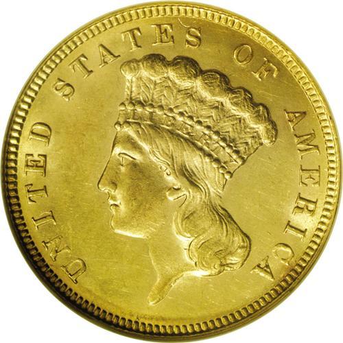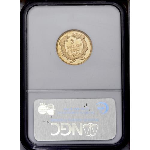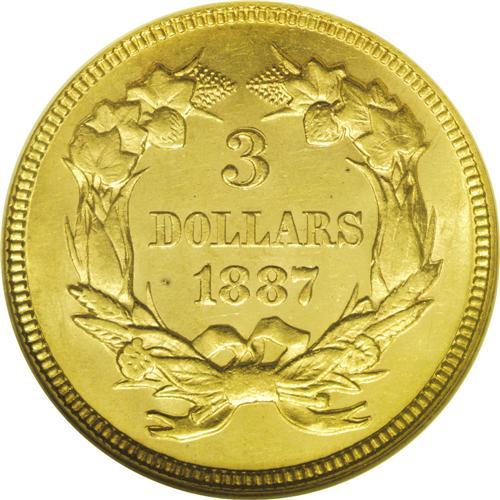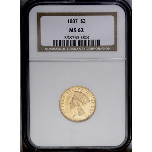 <B>1887 $3 MS62 NGC.</B></I> The 1887 is one of the more frequently encountered dates in the series with 6,000 pieces originally struck. The yellow-gold surfaces are bright with the often-seen mix of prooflikeness and mint frost in the fields. Well defined (except for the hair over Liberty's ear and the knot in the bow). A few minor scuffs are seen over each side, and a couple of tiny flecks are noted in the field beneath the D in DOLLARS.