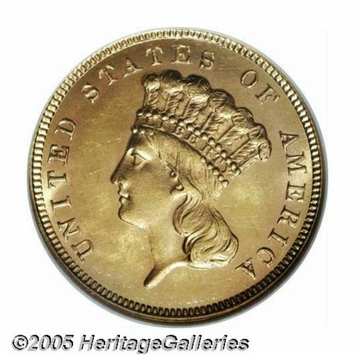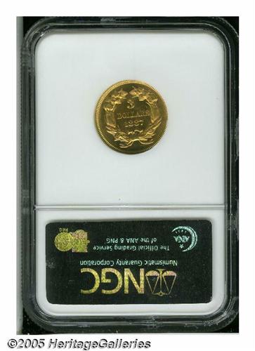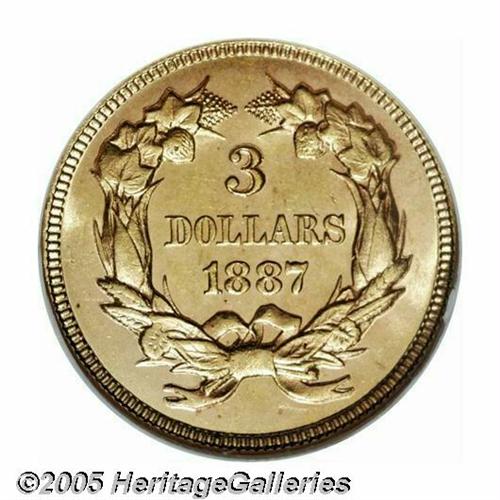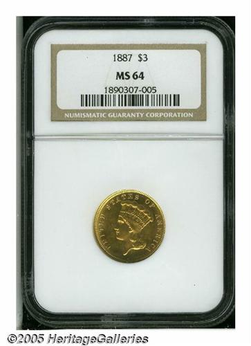 <B>1887<$3> MS64 NGC.</B></I> This is a wonderful example of the date, and it is a highly desirable type coin as well. The business strike mintage was a mere 6,000 coins, and few of those survive any finer than this one. The surfaces have brilliant yellow-gold color with satiny luster. Most of the design details are sharply defined with weakness only apparent on the ribbon knot. The surfaces are exceptional for the grade. Nearly Gem quality, this is an important opportunity for the advanced collector.