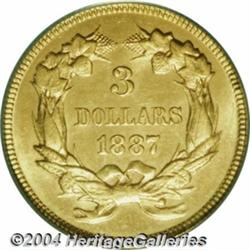 <table><tr><td><table><tr><td>1887 $3 MS64 PCGS. One of the more frequently encountered dates in the Three Dollar series, this piece is fairly typical for an 1887 with its satiny fields and a touch of prooflikeness. Just a bit softly struck, there are only a few tiny abrasions on each side that account for the less-than-Gem grade. Population: 36 in 64, 29 finer (3/04). <BR><BR><B>Important notice:</B> Heritage usually auctions material at the rate of 200-250 lots per hour. On some occasions eBay Live bid software or the Internet may not be able to keep up with the pace of the auction. We recommend placing a realistic absentee bid now as insurance to avoid disappointment. Occasionally the auctioneer may eliminate or reject an eBay Live bid, and the auctioneer may also reopen a lot after the close of the eBay live bidding (usually because we missed an audience bid), and may reject your bid even if it shows you as the winning bidder. By bidding via eBay Live, you agree that Heritage may award the lot to another bidder at its sole discretion under the circumstances described above or any other reasonable circumstances. Since eBay bids are not shown to us until we open the lot on the floor, we treat those bids just like floor bids. In most cases the floor responds before the eBay bid is presented to us, due to Internet lag time, so for consistency we have made it a policy that floor bids are always considered first over tie eBay live bids. Also please note that all Heritage lots purchased through eBay Live carry a 20% Buyer's Premium. Please make sure you read the Terms and Conditions before you bid. <BR><BR><B>IMPORTANT ANNOUNCEMENT ABOUT RESERVES:</B> Heritage now divulges all reserves on its web site 7 days before every auction. If you want to know whether the reserve on this lot has been met, and if not, what the reserve amount is, please visit this lot page on the HeritageCoin.com web site, or email: bid@HeritageGalleries.com </span></font></td></tr></table></td></tr></table>