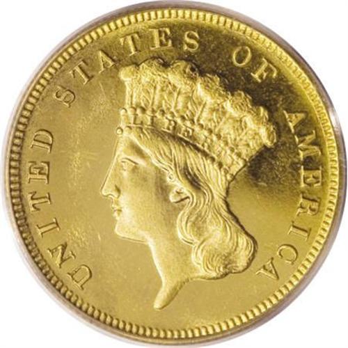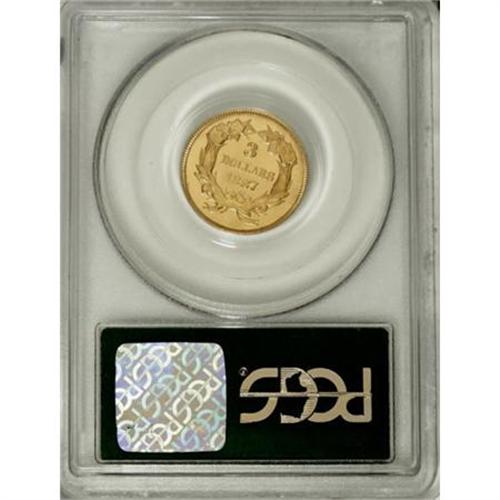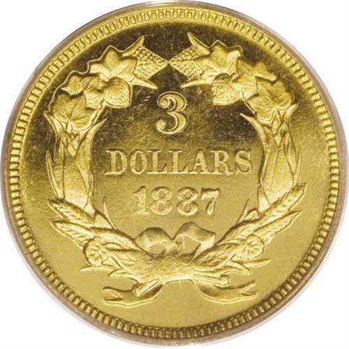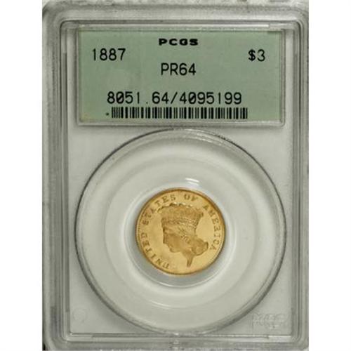 <B>1887 $3 PR64 PCGS.</B></I> In his <I>The United States $3 Gold Pieces</B></I>, David Bowers notes that 1887 proof three dollar coins (160 pieces minted): "... are among the more available in the context of the $3 series, but are rare on an absolute basis." Bowers estimates that 90 to 120 examples are extant.<BR> The peach-gold surfaces of this PR64 example display a degree of field-motif contrast; indeed, both sides yield somewhat of a gold-on-black appearance. A well executed strike brought out sharp definition on the design features, except for softness on the bowknot. The left obverse field exhibits a grainy finish, which is common to this issue. Bowers calls this: "... an 'aura' or 'halo' of graininess in the obverse field, common to other proof threes of this era." Housed in a green-label holder. Population: 25 in 64, 19 finer (6/07).<BR><BR><B>Coin Engraver:</B> James B. Longacre<BR><BR><b>Shipping:</b> Coins & Currency (<a target="_blank" href="http://www.heritageauctions.com/common/shipping.php">view shipping information</a>\)
