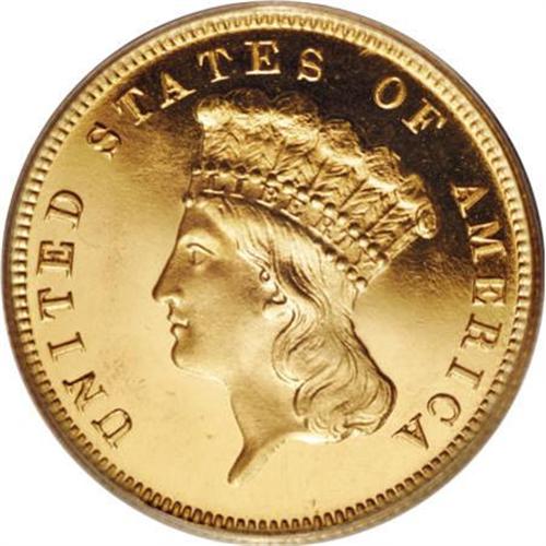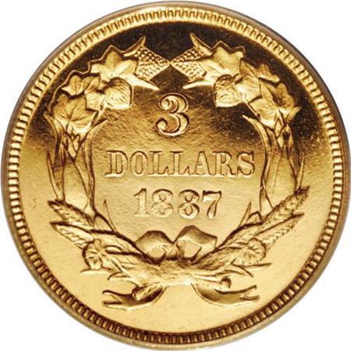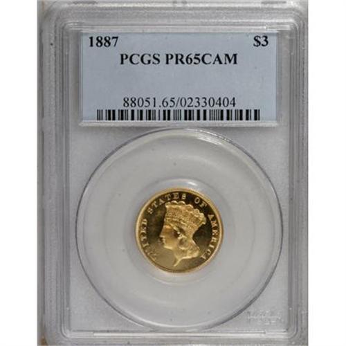 <B>1887 $3 PR65 Cameo PCGS.</B></I> The 1887 three dollar proof saw a mintage of 160 pieces, a relatively large number of which are estimated to exist. David Bowers and Douglas Winter, in their three dollar gold reference book, estimate 90 to 120 examples to be extant. With respect to the number of certified specimens, PCGS and NGC have graded approximately 90 coins. About 30 pieces have been designated cameos.<BR> Vibrant yellow-gold surfaces on the Gem Cameo being offered in this lot display a gold-on-black appearance when the coin is observed from an overhead, direct angle. An impressive strike leaves sharp definition on the design features, except for weakness on the bowknot. A few minor handling marks in the fields likely preclude an even higher grade. Population: 5 in 65 Cameo, 7 finer (9/07).<BR><BR><b>Shipping:</b> Coins & Currency (<a target="_blank" href="http://www.heritageauctions.com/common/shipping.php">view shipping information</a>)
