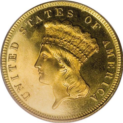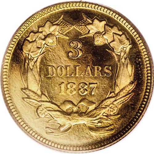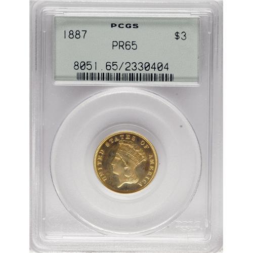 <B>1887 $3 PR65 PCGS.</B></I> Many examples were saved of this proof emission from near the end of the series, so that numerous certified examples exist today, including some proofs that are double- or triple-struck, the dies being rotated between strikes. This piece shows no such reverse doubling. However, the reverse die is slightly rotated, perhaps 10 degrees counterclockwise from normal coin turn. This piece shows pronounced cameo contrast, with pristine, reflective fields and thickly frosted devices. Under a loupe, a small patch of contact marks appears in the left obverse field, and a small group of marks appears on the reverse near the left rim. Those marks, however, fail to diminish this piece's significant allure. Certified in a green-label holder. PCGS has certified only 12 pieces in Gem grade including this piece, with seven coins finer (4/07).<BR><BR><b>Shipping:</b> Coins & Currency (<a target="_blank" href="http://www.heritageauctions.com/common/shipping.php">view shipping information</a>)