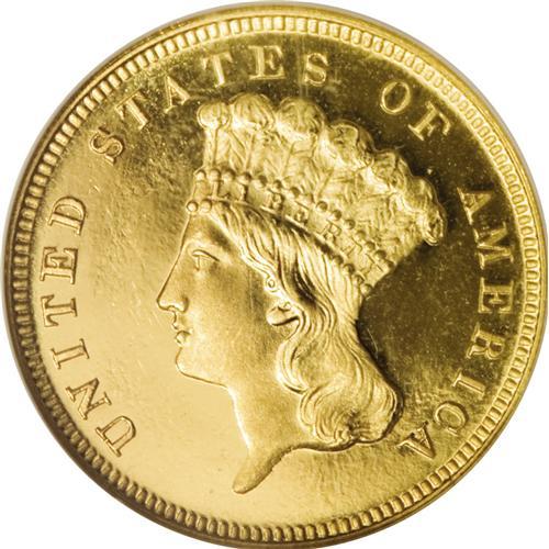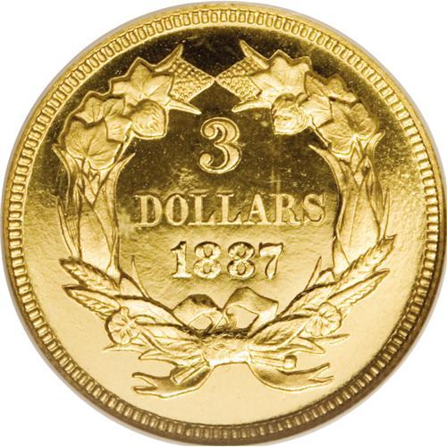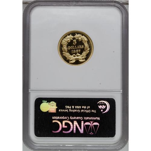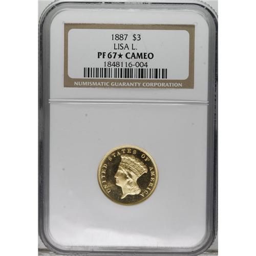 <B>1887 $3 PR67 <img border='0' src='http://www.heritagecoins.com/images/star.gif' width=10 height=10> Cameo NGC.</B></I> This Superb Gem Cameo proof is a conditionally rare item indeed. While it is not the finest certified, it is a most attractive specimen, with bright yellow-gold color and excellent eye appeal. The fields are deeply mirrored around frosty devices, creating the highly desirable cameo appearance. Devoid of hairlines or handling marks, this special coin exhibits the pristine appearance of a meticulously preserved example. This piece is struck from a normal, slightly rotated reverse die, not the doubled reverse die found on all business strikes. Some proofs are from this orientation, others are from normal coin-turn alignment, and still others are from medallic alignment, with the reverse rotated 180 degrees. A few unusual specimens were double struck, with the first impression from normal die alignment and the second from medallic alignment.<BR> Q. David Bowers believes that approximately 90 to 120 proofs survive, from an original mintage of 160 coins. Of these, the certified population is nearly equally divided between Cameo and non-Cameo specimens, in the estimation of NGC and PCGS (3/07). Of course, Superb Gems are rare, as they are with almost any issue. PCGS has yet to encapsulate an 1887 proof at PR67, while NGC has only seen six coins worthy of this lofty grade assessment. Of the seven Superb Gems at NGC, this specimen is one of only two to receive the coveted "Star" designation, denoting exceptional eye appeal.<BR><I>From The Dr. Robert J. Loewinger Collection.</B></I><BR><BR><b>Shipping:</b> Coins & Currency (<a target="_blank" href="http://www.heritageauctions.com/common/shipping.php">view shipping information</a>)
