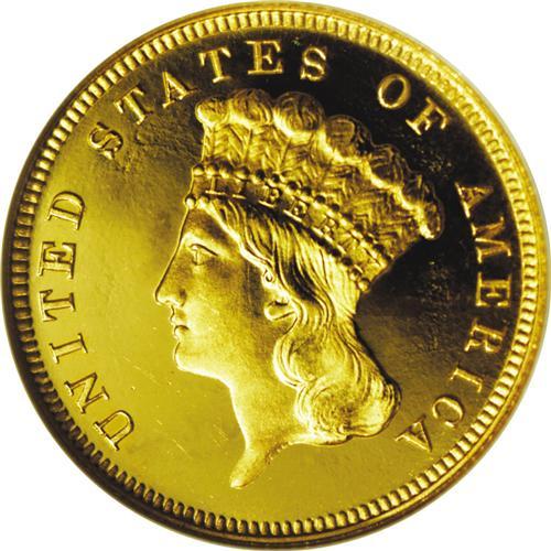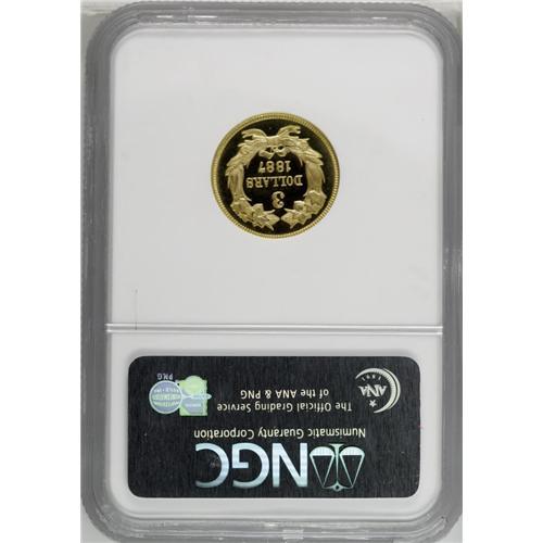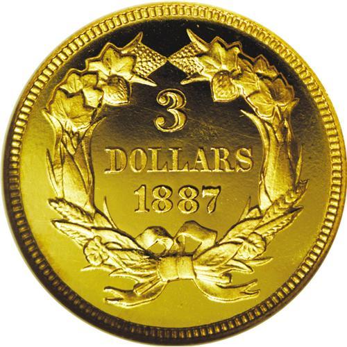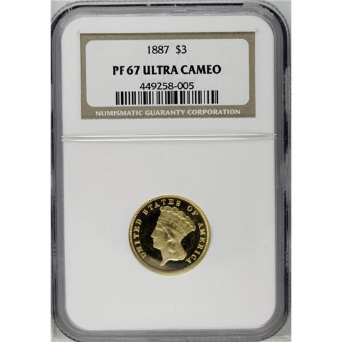 <B>1887<$3> PR67 Ultra Cameo NGC.</B></I> An awe-inspiring proof three dollar whose nearly flawless yellow-gold surfaces literally sparkle with glassy brilliance. In addition, the heavy mint frost on the devices provides remarkable, indeed profound contrast. As occasionally seen on proof threes from this year, this Superb specimen is struck with medallic alignment.<BR> The proof mintage for the 1887 three dollar is listed at 160 pieces, second highest in the series. Roughly half of the mintage is believed to survive as recognizable proofs. Of course, only a tiny fraction of that number could possibly be extant in such a splendid state of preservation, fewer still with the stark contrast displayed by this majestic specimen. Census: 3 in 67 Ultra Cameo, 0 finer (4/06).