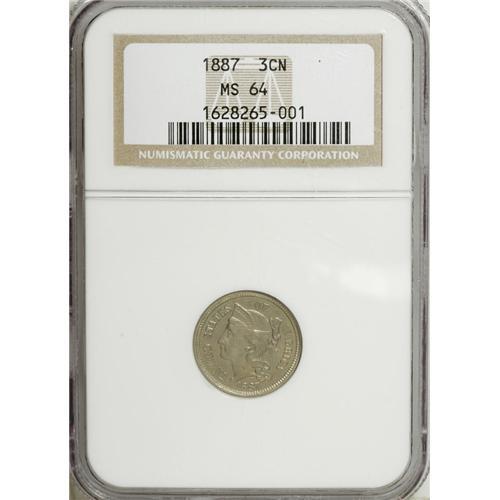 <B>1887 3CN MS64 NGC.</B></I> NGC Census: (25/24). PCGS Population (27/32). Mintage: 5,000. Numismedia Wsl. Price: $580. (#3755)<BR><BR><b>Shipping:</b> Coins & Currency (<a target="_blank" href="http://www.heritageauctions.com/common/shipping.php">view shipping information</a>)