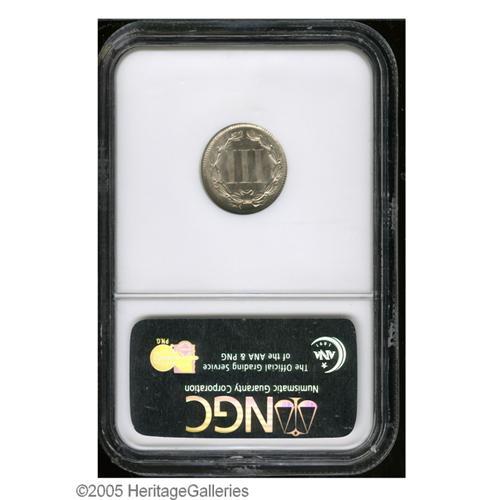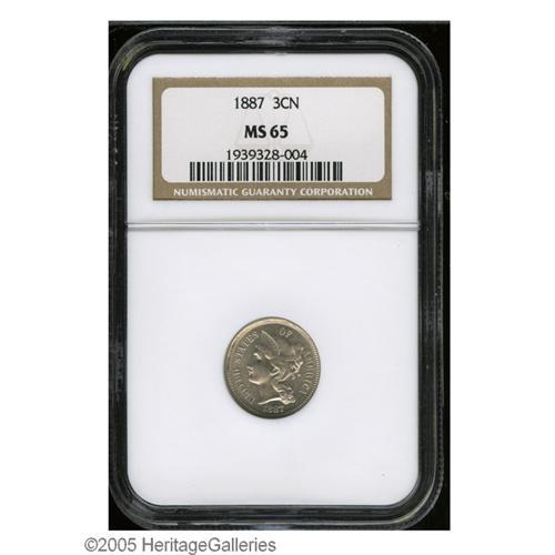 <B>1887<3CN> MS65 NGC.</B></I> Highly lustrous with just a hint of incipient toning here and there. Sharply struck throughout, and no offensive marks. Population: 26 in 65, 8 finer (9/05).