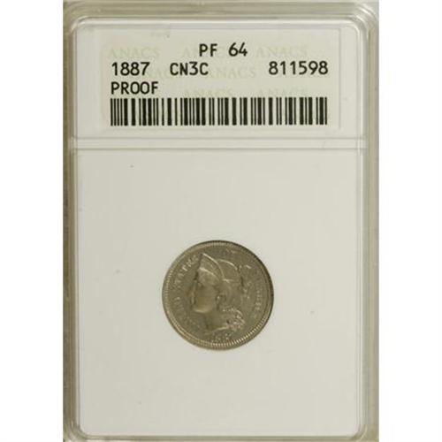 <B>1887 3CN PR64 ANACS.</B></I> NGC Census: (135/114). PCGS Population (218/149). Mintage: 2,960. Numismedia Wsl. Price for NGC/PCGS coin in PR64: $380. (#3783)<BR><BR><B>Coin Engraver:</B> James B. Longacre<BR><BR><b>Shipping:</b> Coins & Currency (<a target="_blank" href="http://www.heritageauctions.com/common/shipping.php">view shipping information</a>)