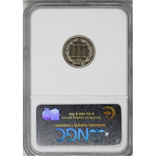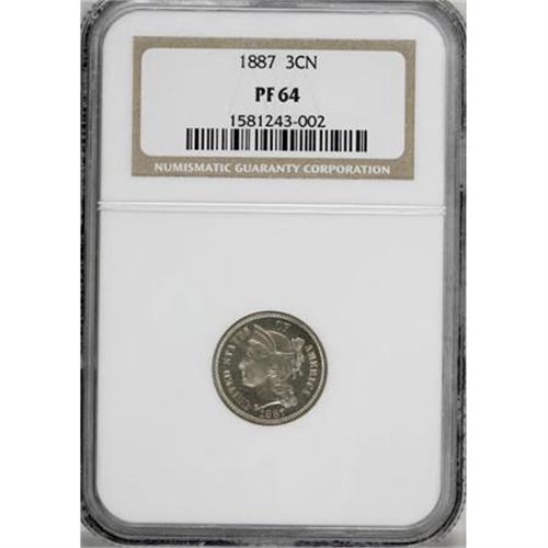 <B>1887 3CN PR64 NGC.</B></I> Warm golden toning graces the shimmering surfaces of this late-date three cent nickel proof. Pleasingly detailed with just a handful of grade-defining hairlines in the fields.<BR><BR><B>Coin Engraver:</B> James B. Longacre<BR><BR><b>Shipping:</b> Coins & Currency (<a target="_blank" href="http://www.heritageauctions.com/common/shipping.php">view shipping information</a>)
