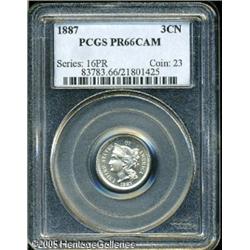 <B>1887 3CN PR66 Cameo PCGS.</B></I> A deeply mirrored example that shows moderate mint frost over the devices. There is just the slightest hint of pastel iridescence over the portrait of Liberty that adds even more to the overall attractiveness of this high grade coin. Population: 8 in 66, 0 finer (1/05).<BR><I>From The Mike Jacobson Collection.</B></I> Lot:5767