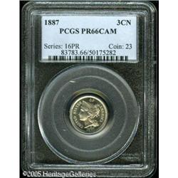<B>1887 3CN PR66 Cameo PCGS.</B></I> Only the lightest trace of golden toning is seen on the reverse of this rare issue with cameo contrast. Deeply mirrored and essentially carbon-free, there are no mentionable post-striking defects on either side. Lot:5828