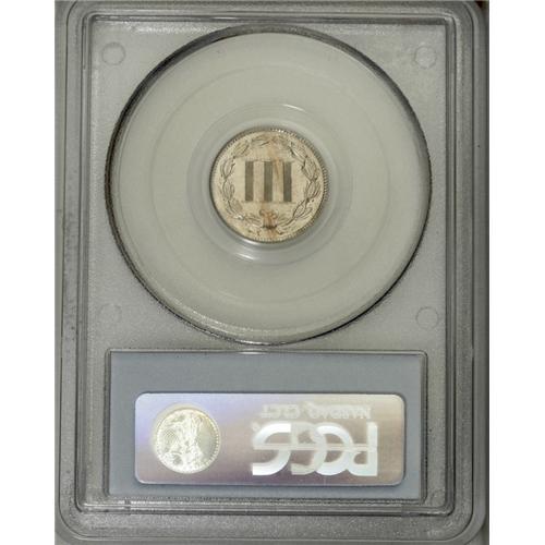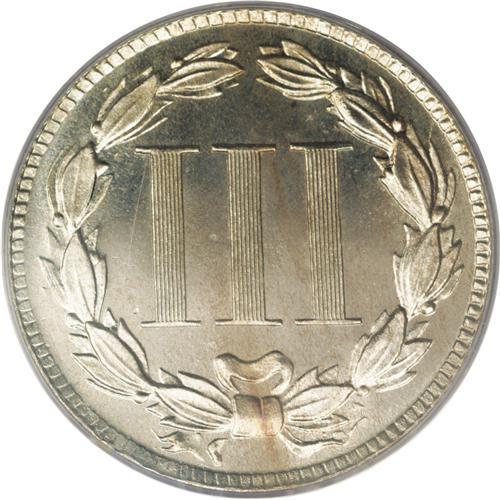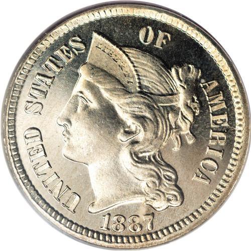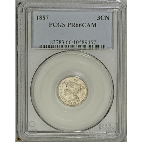 <B>1887 3CN PR66 Cameo PCGS.</B></I> A hint of rose-gold in the center of the reverse adds color to this moderately reflective and strongly contrasted Premium Gem. Boldly impressed, though some design loss is noted, particularly at the lower reverse. A light flaw is noted to the left of the III within the wreath. Population: 8 in 66 Cameo, 0 finer (10/06).<BR><I>From The Dr. Robert J. Loewinger Collection.</B></I><BR><BR><b>Shipping:</b> Coin/Currency (<a target="_blank" href="http://www.heritageauctions.com/common/shipping.php">view shipping information</a>) <BR><BR><B>Important noti