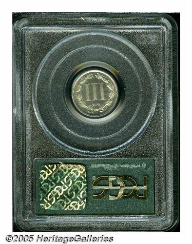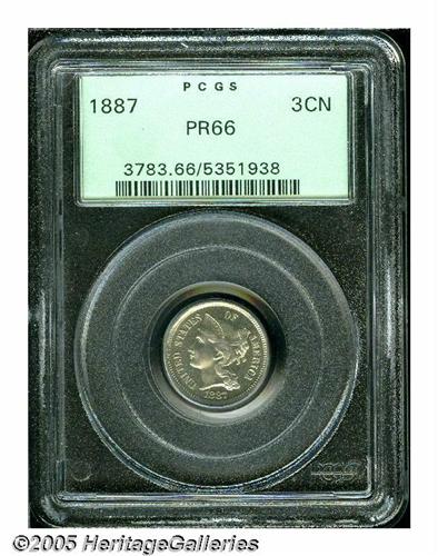 <B>1887<3CN> PR66 PCGS.</B></I> An attractive, satiny Superb-Gem. Weakly struck on the left sides. Die polishing has removed some of the wreath detail from the reverse, but the centers are reasonably strong.